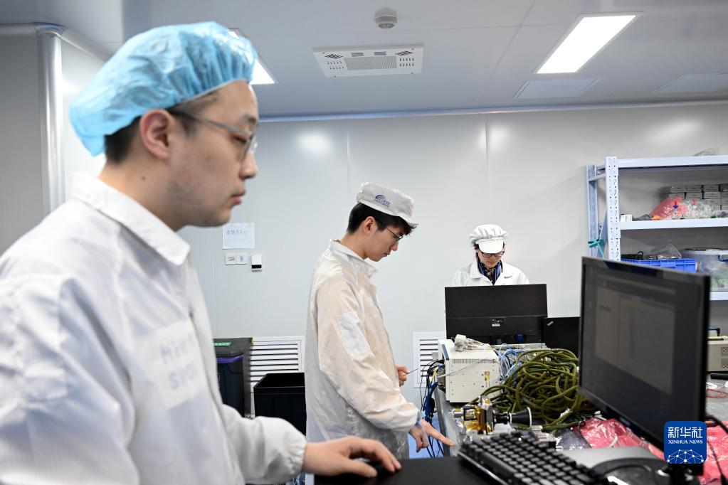 4月18日,在中科院合肥物質(zhì)科學(xué)研究院,安徽光學(xué)精密機械研究所光學(xué)遙感研究中心副研究員路美娜(后)和同事李揚(中)、聶安然在進(jìn)行載荷分系統聯(lián)調。