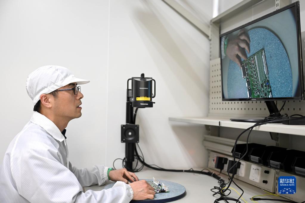 4月18日,在中科院合肥物質(zhì)科學(xué)研究院,安徽光學(xué)精密機械研究所環(huán)境光學(xué)研究中心成像光譜技術(shù)研究室副主任趙欣使用視頻放大儀器檢查電路板焊接質(zhì)量。
