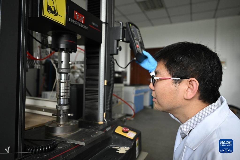 4月19日,在中科院合肥物質(zhì)科學(xué)研究院,固體物理研究所內耗與固體缺陷研究部研究員蔣衛斌在測量減振彈簧的力學(xué)強度。