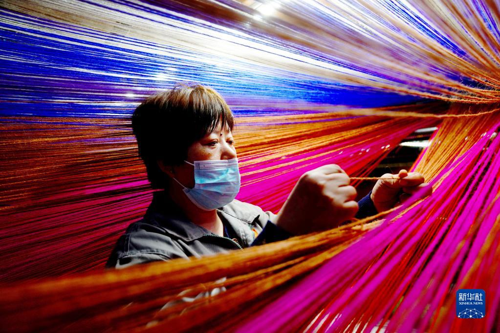 4月22日,在惠民縣辛店鎮“惠民工坊”,一名工作人員在接紡線(xiàn)。