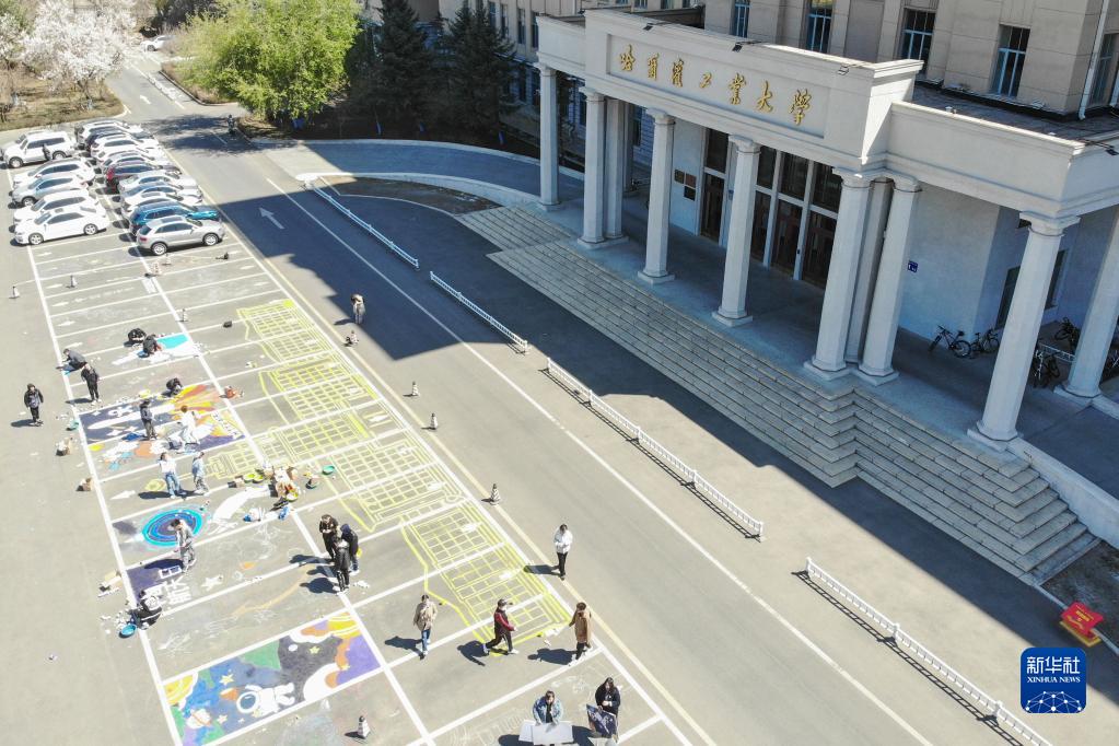 4月22日,在哈爾濱工業(yè)大學(xué)校園,學(xué)生在進(jìn)行航天主題的大地彩繪(無(wú)人機照片)。