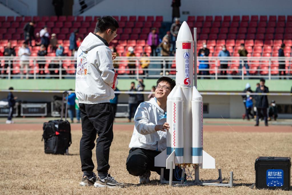 4月22日,在哈爾濱工業(yè)大學(xué)體育場(chǎng),航模協(xié)會(huì )的學(xué)生在航模點(diǎn)火發(fā)射前進(jìn)行調試。