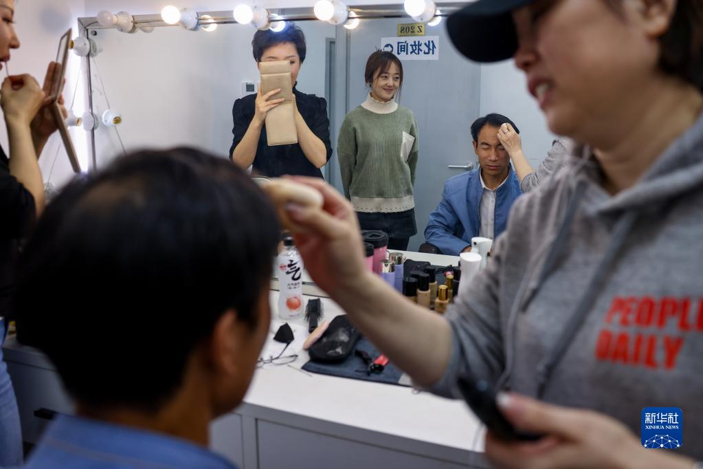 4月12日,在中國教育電視臺一處化妝間,化妝師為朱彥軍(右二)化妝?!邦^發(fā)有點(diǎn)長(cháng),得整整”,朱彥軍憨厚地說(shuō)。新華社記者 劉金海 攝