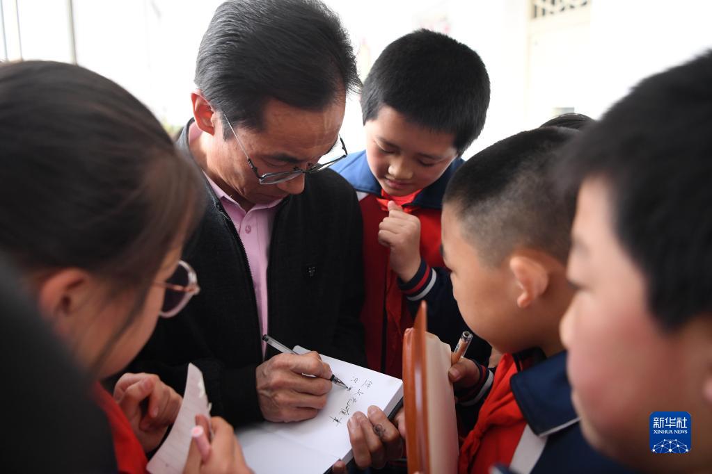 在靜寧縣城關(guān)小學(xué),朱彥軍在孩子們的筆記本上書(shū)寫(xiě)詩(shī)詞,鼓勵孩子們熱愛(ài)閱讀(4月10日攝)。新華社記者 陳斌 攝