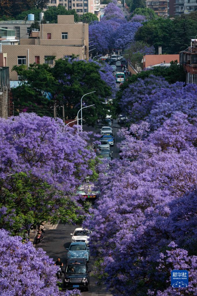 昆明市教場(chǎng)中路的藍花楹綻放(4月22日攝)。