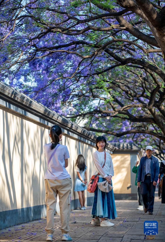 近日,位于云南省昆明市教場(chǎng)中路的藍花楹綻放,吸引市民和游客前來(lái)拍照打卡。