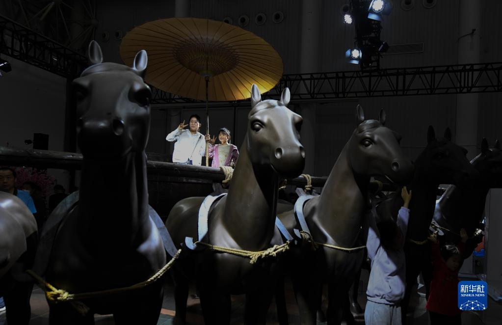 4月22日,觀(guān)眾在博覽會(huì )上體驗楚王車(chē)馬陣。