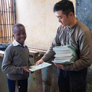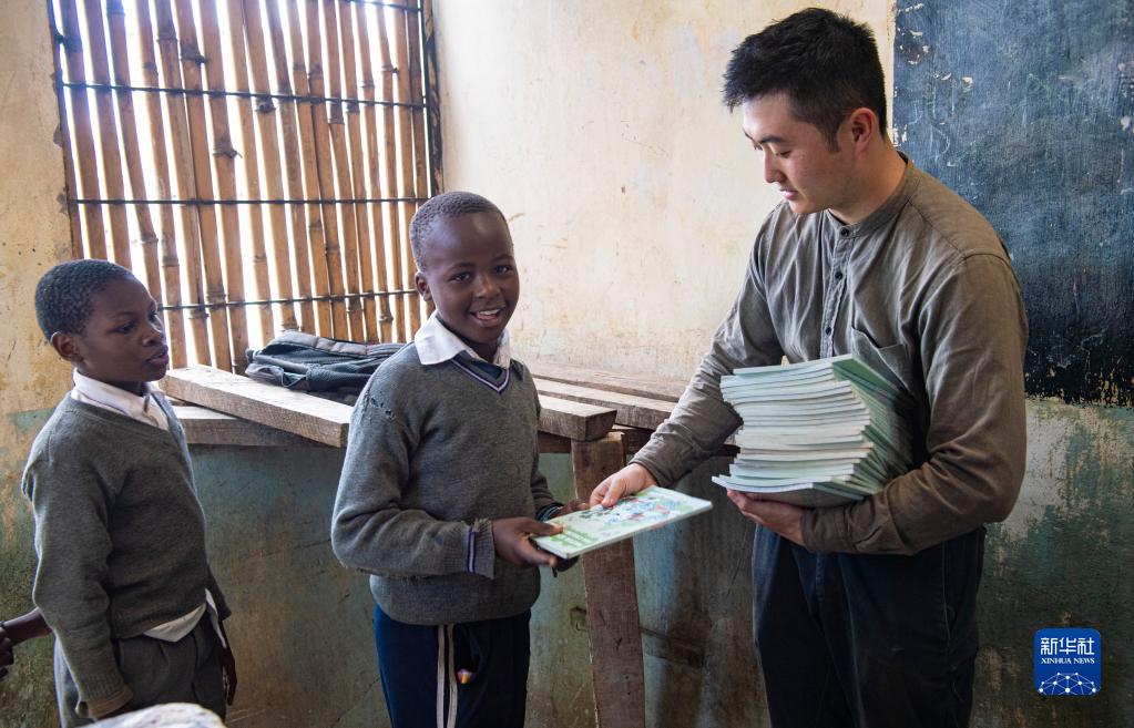 4月19日,在肯尼亞內羅畢馬薩雷貧民區的一所小學(xué),劉宜孟翰為學(xué)生們發(fā)放書(shū)本。