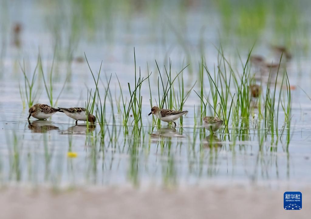 4月21日,在閩江河口國家濕地公園里,一群紅頸濱鷸在濕地水草中覓食。