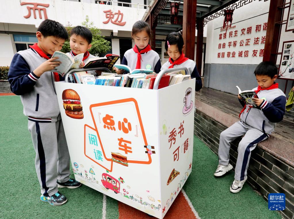 4月21日,在江蘇省蘇州市胥江中心小學(xué)校,學(xué)生在課間翻閱“閱讀點(diǎn)心車(chē)”上的圖書(shū)。