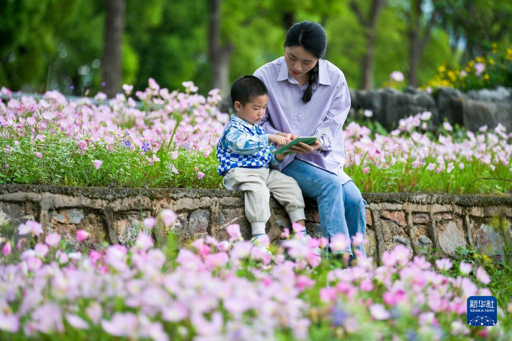 4月22日,家長(cháng)帶著(zhù)孩子在貴州省遵義市余慶縣一公園內讀書(shū)。