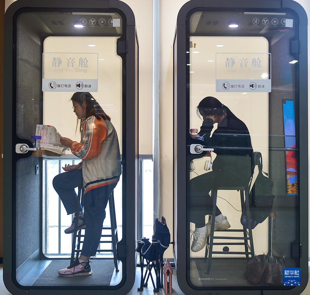 4月22日,讀者在河南省洛陽(yáng)市圖書(shū)館“靜音艙”內讀書(shū)學(xué)習,享受安靜的閱讀空間。