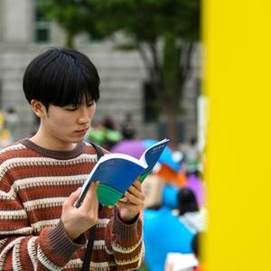 4月23日,一名男子在韓國首爾廣場(chǎng)上閱讀圖書(shū)。