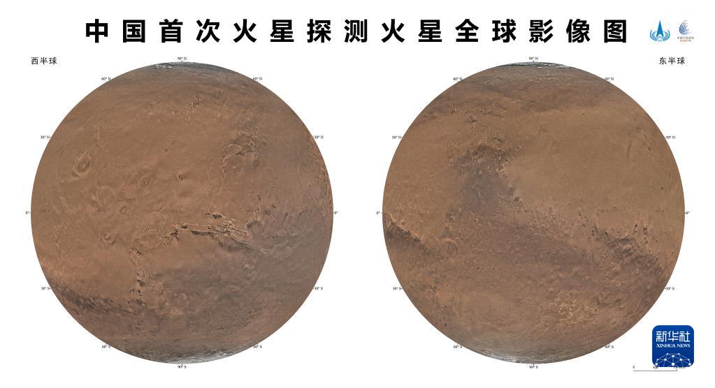 這是4月24日發(fā)布的火星東西半球正射投影圖。