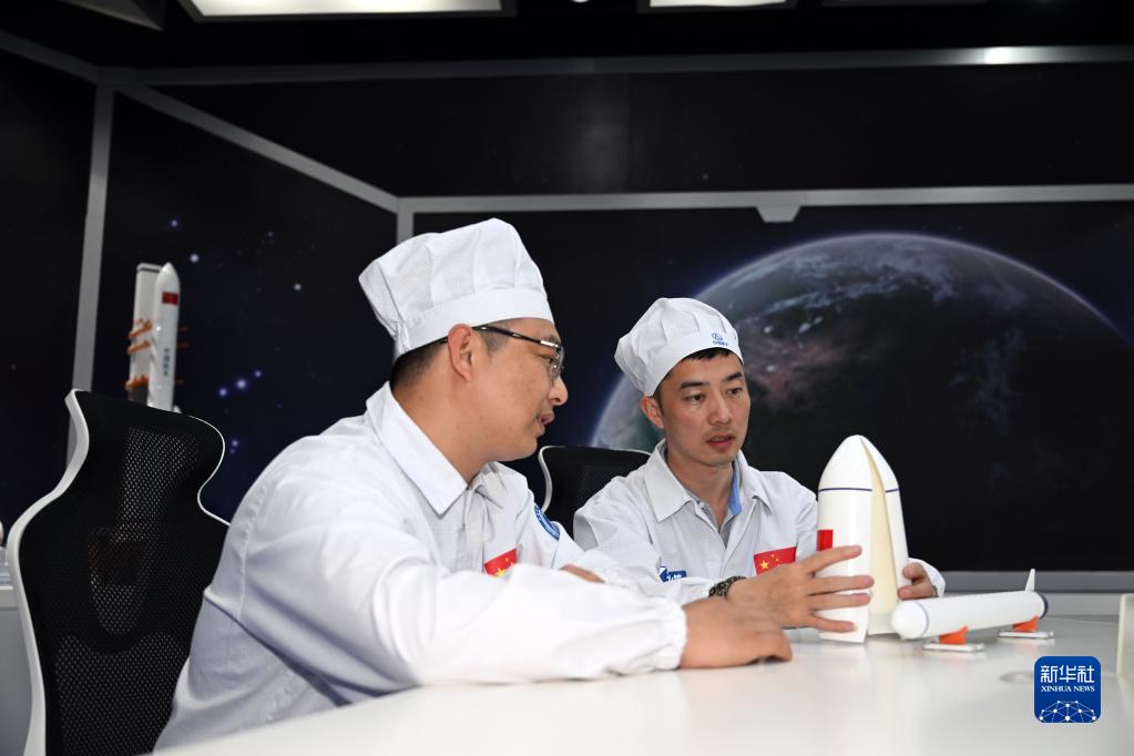 在航天科技集團一院天津火箭公司總裝測試車(chē)間,駱鑫生(右)和班組副組長(cháng)王海洋模擬火箭裝配工作(4月19日攝)。