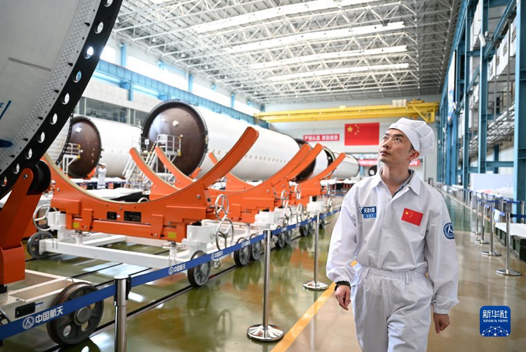 在航天科技集團一院天津火箭公司總裝測試車(chē)間,駱鑫生在觀(guān)察火箭某部件(4月19日攝)。