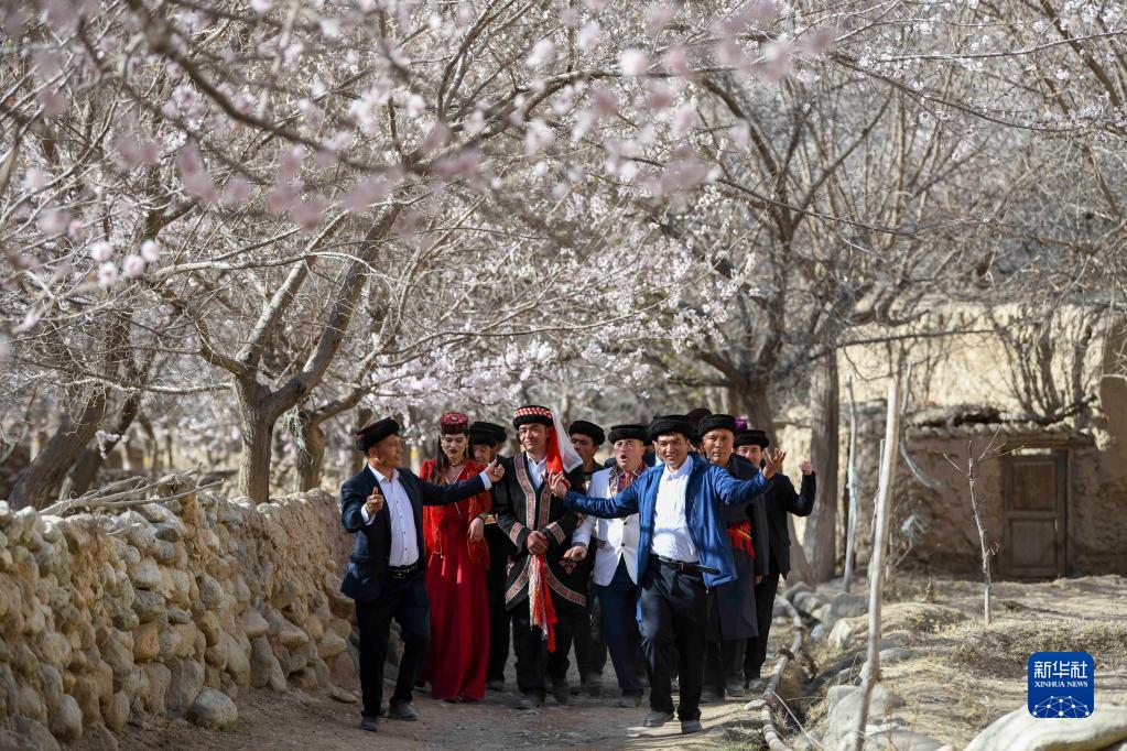 新疆阿克陶縣塔爾塔吉克民族鄉巴格艾格孜村,人們?yōu)橛慰捅硌輦鹘y婚俗中的迎親儀式(3月28日攝)。