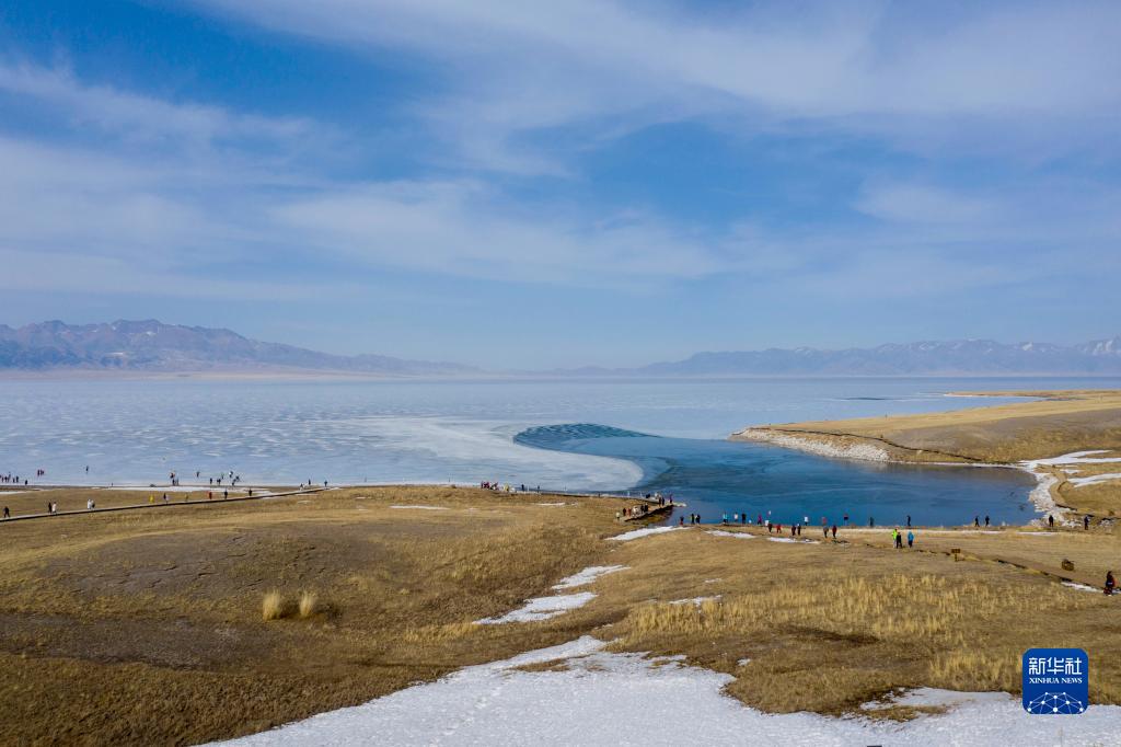 在新疆博爾塔拉蒙古自治州拍攝的賽里木湖(4月6日攝,無(wú)人機照片)。4月,隨著(zhù)氣溫不斷升高,冰封數月的湖面逐漸融化,巨大的冰面在湖水的作用下涌向岸邊,綿延數十公里。因湖水含有礦物質(zhì),“冰推”期的賽里木湖冰面呈現獨特的淡藍色。