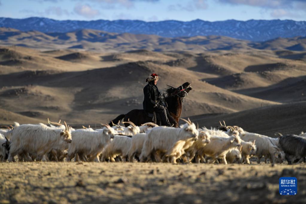 新疆塔城地區裕民縣,牧歸時(shí)分,牧民哈布得拉什么騎馬趕著(zhù)羊群行進(jìn)在春草場(chǎng)上(4月12日攝)。
