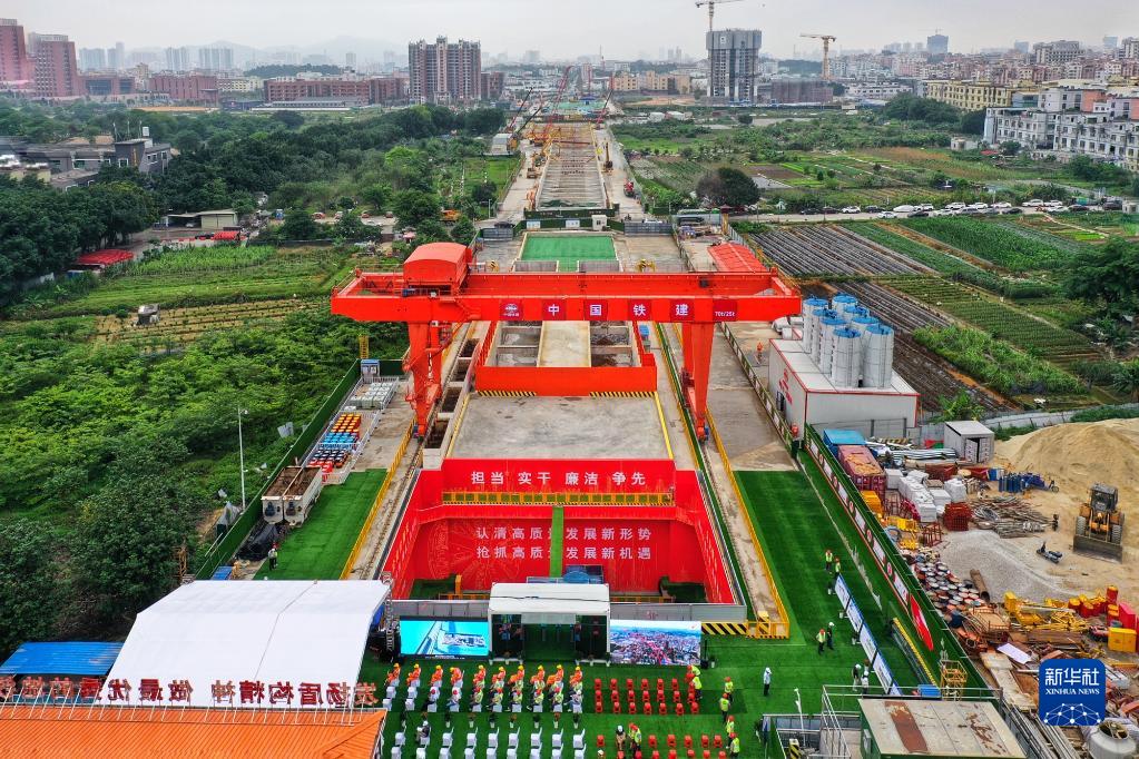 4月24日,廣花城際“鐵兵廣花13號”盾構機始發(fā)現場(chǎng)(無(wú)人機照片)。