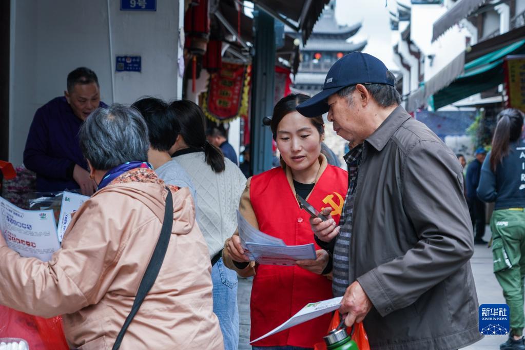 4月24日,在建德市梅城鎮古街,社區黨員志愿者在向游客、商家宣傳亞運知識。