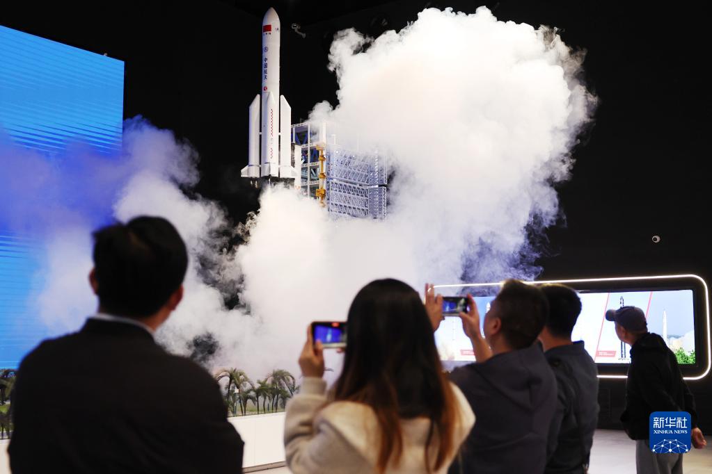 4月24日,觀(guān)眾在中國航天博物館觀(guān)看長(cháng)征五號運載火箭發(fā)射轉運場(chǎng)景模擬演示。