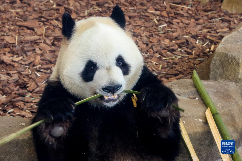 4月24日,在成都大熊貓繁育研究基地,大熊貓“芝麻”在吃竹子。 新華社發(fā)(陳居偉 攝)