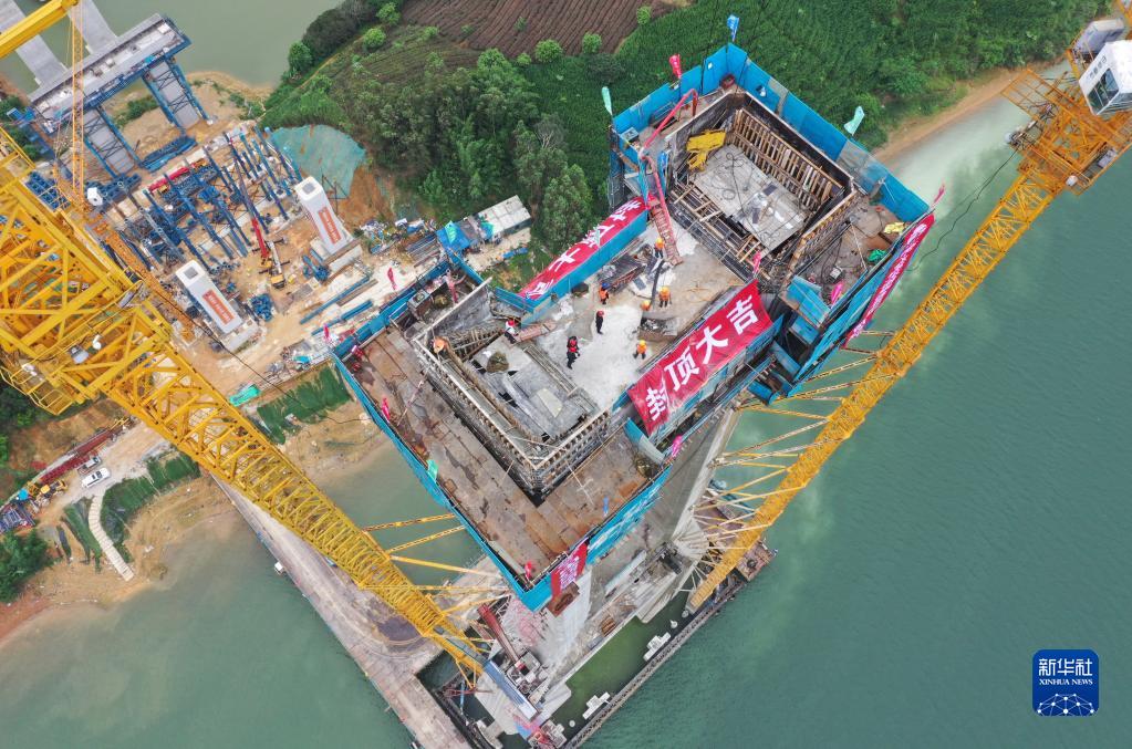 4月24日,在廣西上橫高速公路西津郁江特大橋建設現場(chǎng),中鐵四局集團工人在進(jìn)行主塔封頂施工(無(wú)人機照片)。