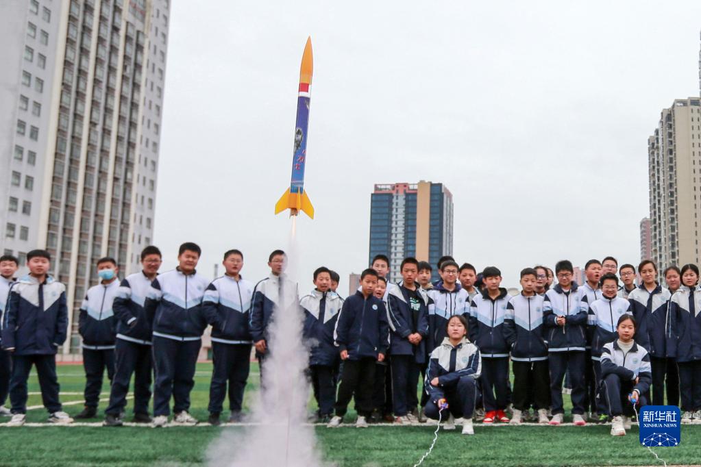 4月24日,安徽省淮北市第二中學(xué)的學(xué)生們體驗發(fā)射“小力士”傘降火箭。