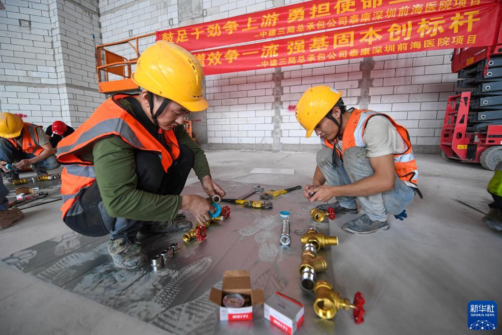 4月25日,在深圳前海泰康國際醫院項目工地,建筑工人參加閥門(mén)組裝工藝技能比拼。