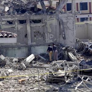 4月25日,在巴基斯坦斯瓦特地區,警察檢查爆炸襲擊現場(chǎng)。