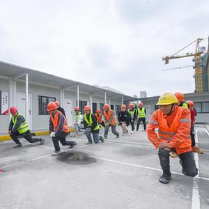 4月25日,社區工作人員帶領(lǐng)工地勞動(dòng)者學(xué)習簡(jiǎn)單的放松操。