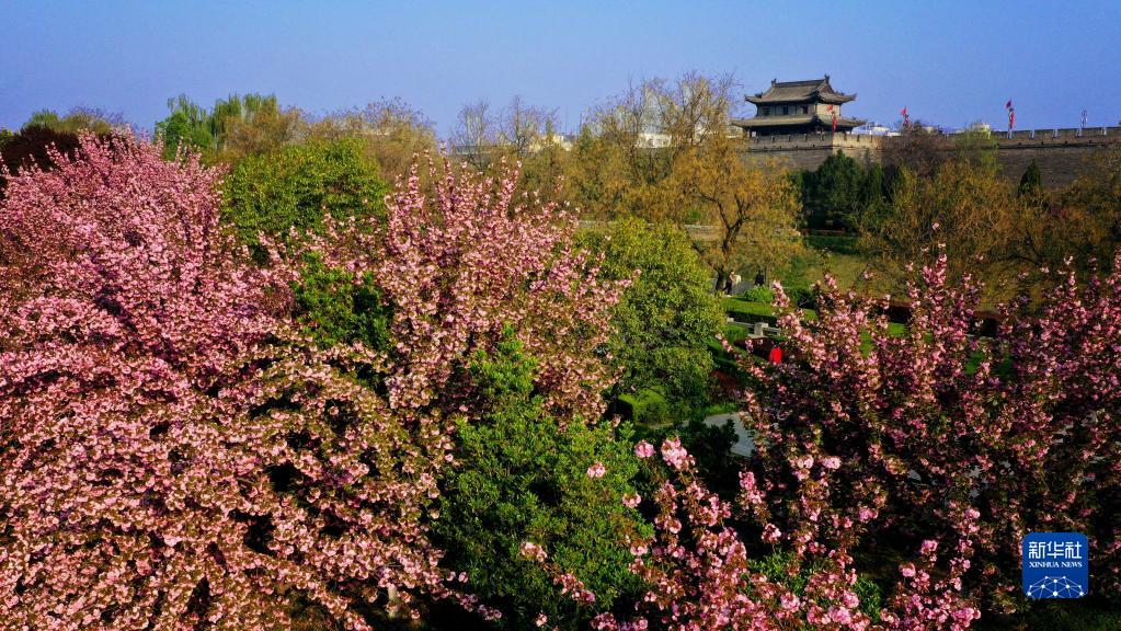 西安明城墻下春花盛開(kāi)(4月1日攝,無(wú)人機照片)。