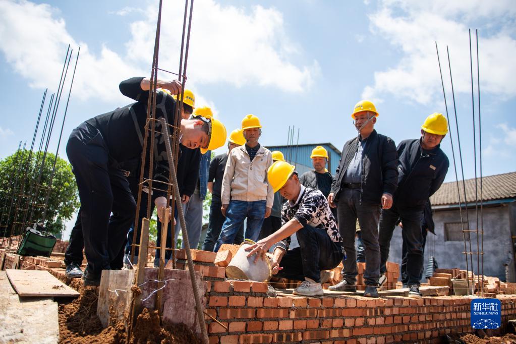 4月25日,在大鯨港鎮五合剅社區,技師(中)向工人們展示砌墻技巧。