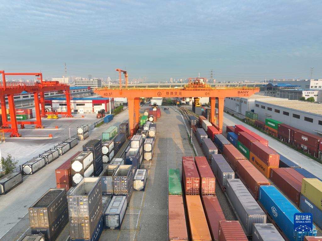 4月25日,在南京貨運中心海安貨運站,集裝箱門(mén)吊進(jìn)行中老鐵路國際貨運列車(chē)化肥專(zhuān)列集裝箱裝運作業(yè)(無(wú)人機照片)。