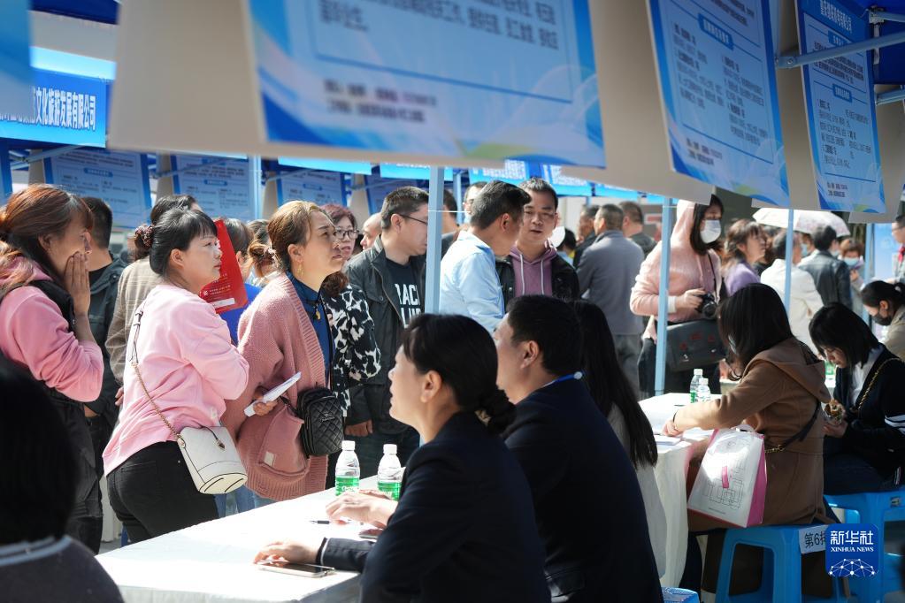 4月25日,求職者在重慶市北碚區吾悅廣場(chǎng)舉行的民營(yíng)企業(yè)服務(wù)月專(zhuān)場(chǎng)招聘會(huì )現場(chǎng)了解用工信息。