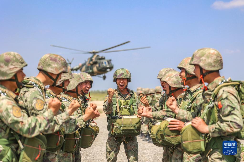 東部戰區陸軍第72集團軍某特戰旅特戰八連組織官兵進(jìn)行傘降實(shí)跳訓練,登機前連長(cháng)給特戰隊員加油鼓勁(2023年4月20日攝)。新華社發(fā)(胡雪峰 攝)
