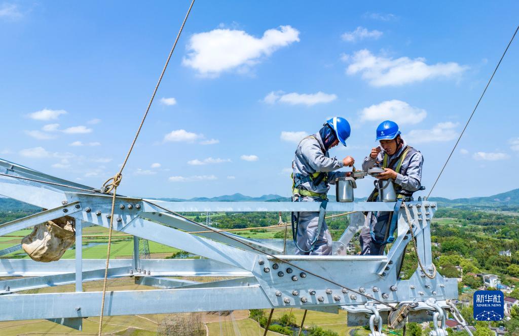 電力工人劉李家(左)、段信陽(yáng)在塔上吃午飯(4月20日,無(wú)人機照片)。
