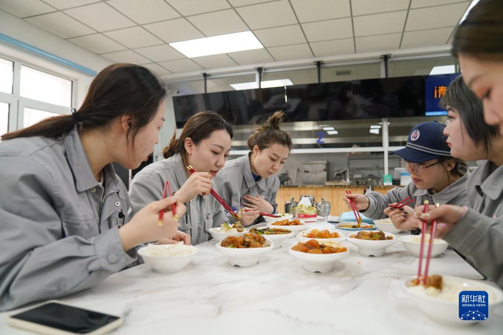 在哈爾濱動(dòng)車(chē)段,“雪絨花”女子班組部分成員在食堂吃午飯(4月25日攝)。