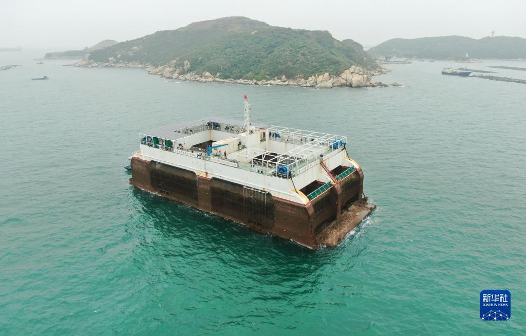 這是在廣東珠海萬(wàn)山海域拍攝的中國首臺半潛式波浪能養殖旅游平臺“澎湖號”(4月25日攝,無(wú)人機照片)。