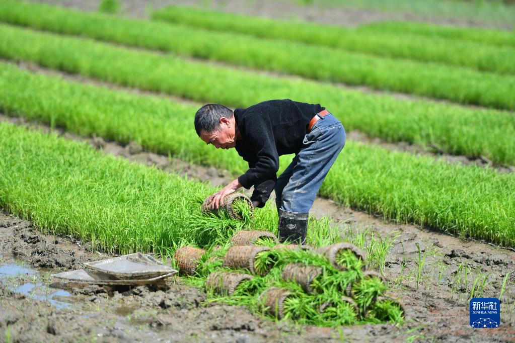 4月26日,在湘潭市雨湖區姜畬鎮易建河村,農民在田間起秧。