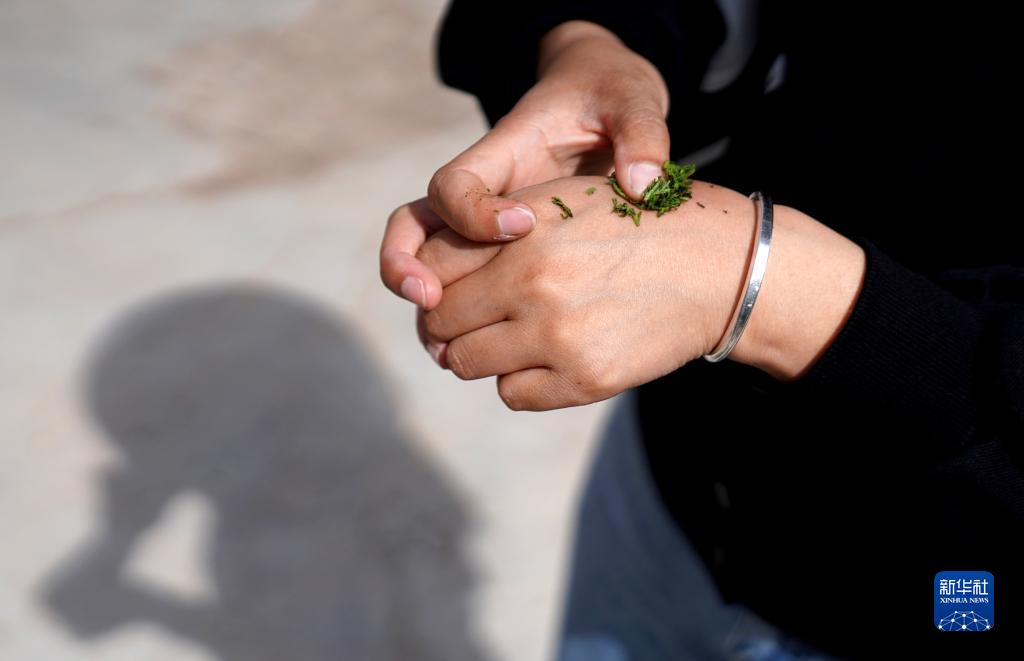 陳曉麗用草藥處理被蜜蜂蜇的傷處(4月18日攝)。新華社記者 李安 攝