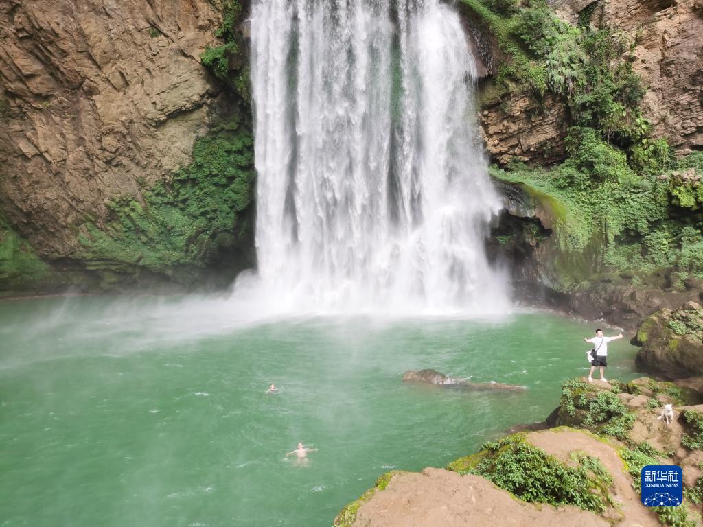 兩名游客在貴州省清鎮市羊皮洞瀑布下方的水潭里游泳(2022年8月11日攝)。