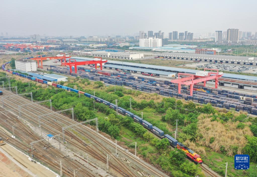 4月26日,“法國郵政DPD號”國際班列從成都國際鐵路港駛出(無(wú)人機照片)。