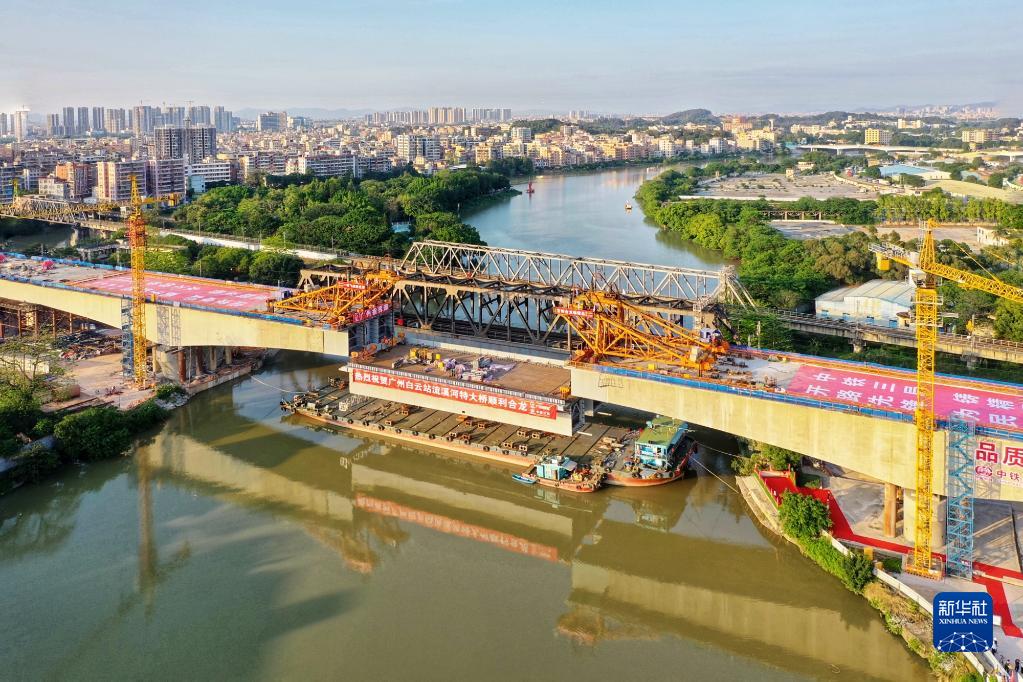 經(jīng)過(guò)中鐵三局施工人員連續6小時(shí)整體吊裝和焊接,廣州白云火車(chē)站流溪河特大橋重達1100噸的鋼箱梁主梁與鋼混連接段于4月27日凌晨順利合龍。流溪河特大橋為京廣高鐵聯(lián)絡(luò )線(xiàn)和廣湛高鐵聯(lián)絡(luò )線(xiàn)四線(xiàn)鐵路并行橋梁。