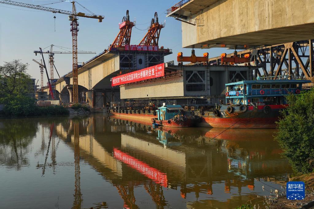流溪河特大橋重達千噸的鋼箱梁主梁進(jìn)行吊裝作業(yè)(4月26日攝)。
