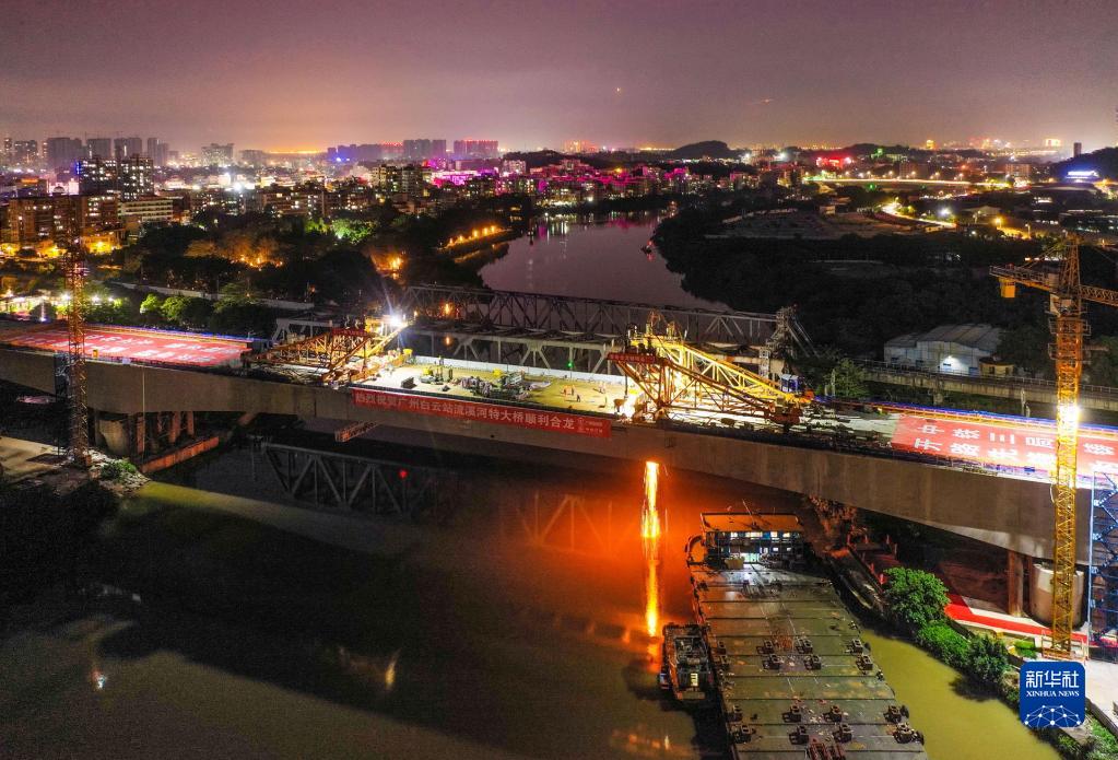 流溪河特大橋重達千噸的鋼箱梁主梁吊裝到位后進(jìn)行焊接,在主控計算機精準操控下合龍間隙僅5毫米(4月26日攝,無(wú)人機照片)。