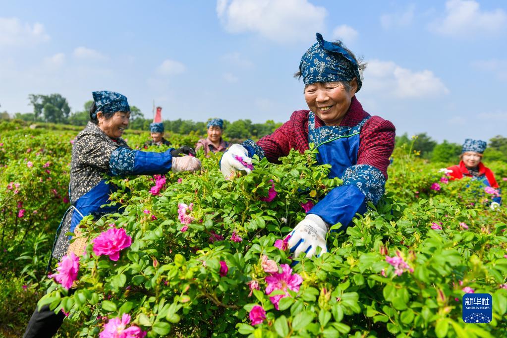 4月26日,農民在浙江省湖州市長(cháng)興縣泗安鎮師姑崗村的百畝玫瑰花基地采收玫瑰花。