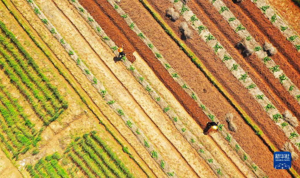 4月26日,在湖南省永州市新田縣驥村鎮黃栗山村,農民在南瓜田里挖土準備套種大豆(無(wú)人機照片)。