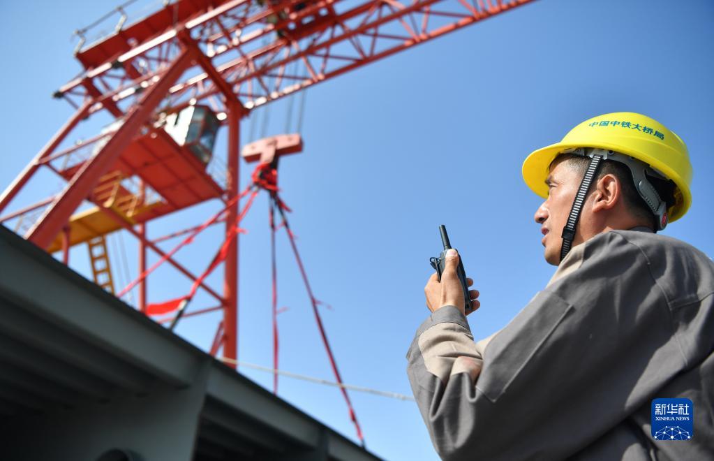 4月27日,工人在施工現場(chǎng)用對講機與龍門(mén)吊司機進(jìn)行溝通。